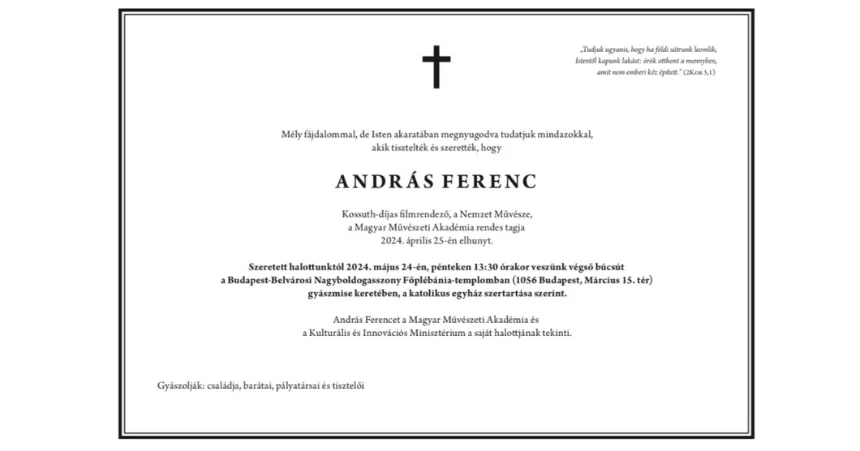 Nyolcvanegy éves korában elhunyt András Ferenc Kossuth- és Balázs Béla-díjas filmrendező, forgatókönyvíró, producer, érdemes művész, a nemzet művésze - jelentette…